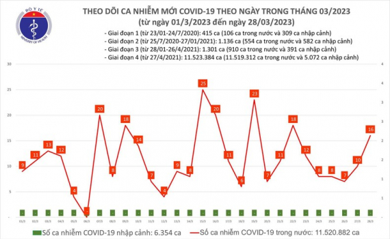 Ngày 28/3, cả nước có 16 ca mắc COVID-19 mới