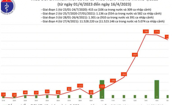 Về tình hình điều trị, theo số liệu do Sở Y tế các tỉnh, thành phố báo cáo hàng ngày trên Hệ thống quản lý của Cục Quản lý Khám, chữa bệnh, Bộ Y tế, trong ngày 16/4, có 50 bệnh nhân được công bố khỏi bệnh, nâng tổng số ca bệnh được điều trị khỏi lên 10.615.393 ca. Hiện có 38 bệnh nhân đang thở oxy, trong đó có 36 ca thở oxy qua mặt nạ, 2 ca thở oxy dòng cao HFNC. Tiếp tục không ghi nhận bệnh nhân tử vong do COVID-19.