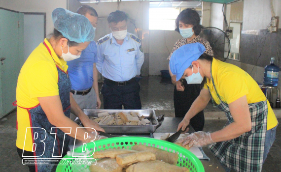 Các thành viên trong đoàn kiểm tra tại bếp ăn tập thể phục vụ các suất ăn cho Công ty TNHH May mặc Spectre Việt Nam.