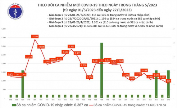 Ngày 27/5, có 839 ca Covid-19 mới, thấp nhất trong hơn 5 tuần qua