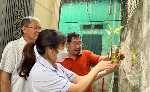Cán bộ y tế hướng dẫn người dân loại bỏ các vật dụng chứa nước có bọ gậy