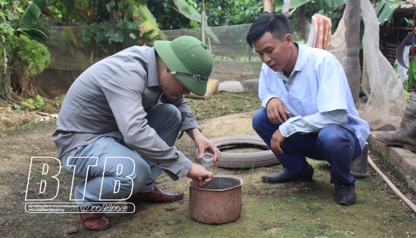 Cán bộ Trung tâm Kiểm soát bệnh tật tỉnh điều tra, giám sát chỉ số bọ gậy, muỗi tại xã Đông Trung (Tiền Hải).
