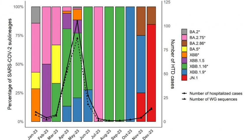 Bệnh viện Bệnh nhiệt đới thành phố và đơn vị nghiên cứu lâm sàng Đại học Oxford (OUCRU) thực hiện giải mã trình tự gen từ mẫu bệnh phẩm của 16 bệnh nhân dương tính với Covid-19 điều trị tại Bệnh viện Bệnh nhiệt đới trong tháng 12/2023. Kết quả có 12/16 bệnh nhân (75%) nhiễm biến thể phụ JN.1 của chủng Omicron. Ngoài ra, có 1 ca nhiễm biến thể JN.1.1; 2 ca nhiễm biến thể BA.2.86.1 và 1 ca nhiễm biến thể XDD.