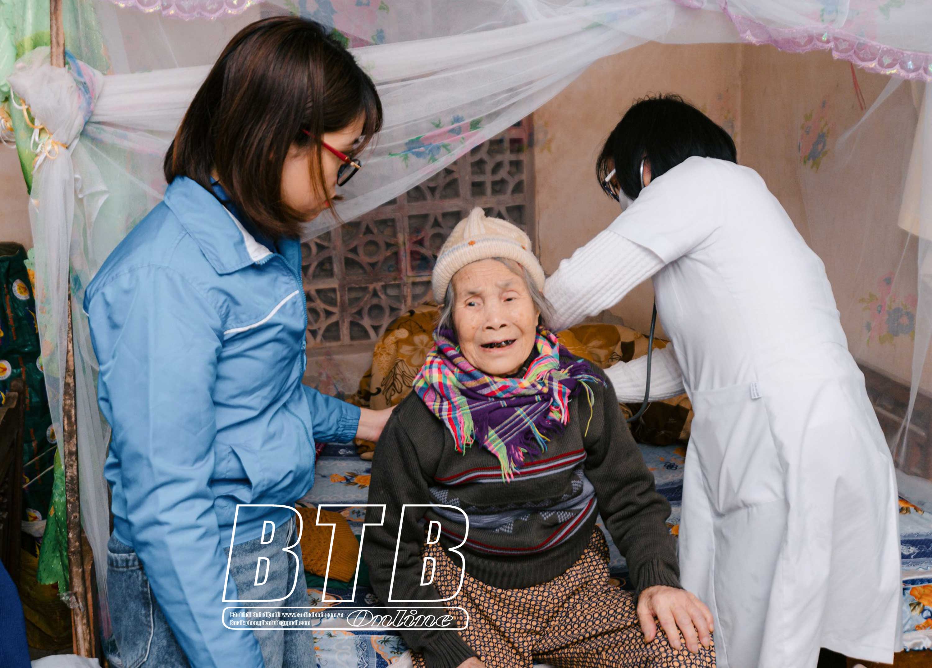 Bác sĩ Bệnh viện Đa khoa huyện Đông Hưng đến nhà thăm khám cho người cao tuổi gặp khó khăn khi đi lại.