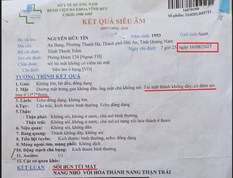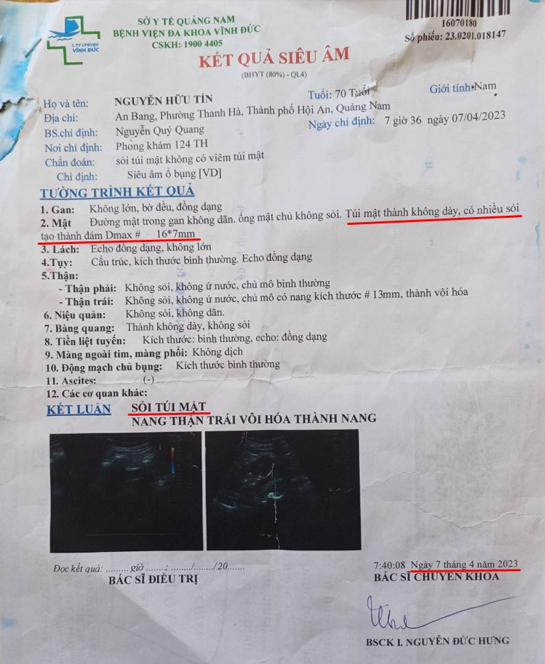 Phiếu siêu âm của chú Tín ngày 07/04/2023 cho thấy có sỏi mật 16x7mm