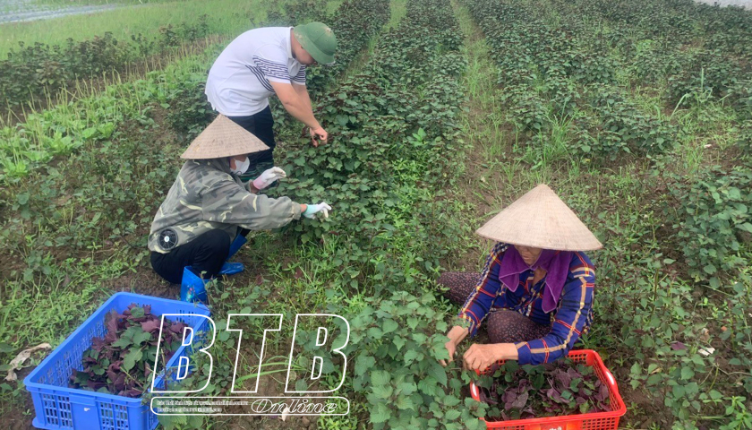 Mới hơn 7 giờ sáng, nhóm phụ nữ thôn Lạc Thành Bắc, xã Tây Ninh đã thu hoạch được nửa luống lá tía tô tím sẫm, ngào ngạt mùi thơm cay nồng mà mát rượi.
