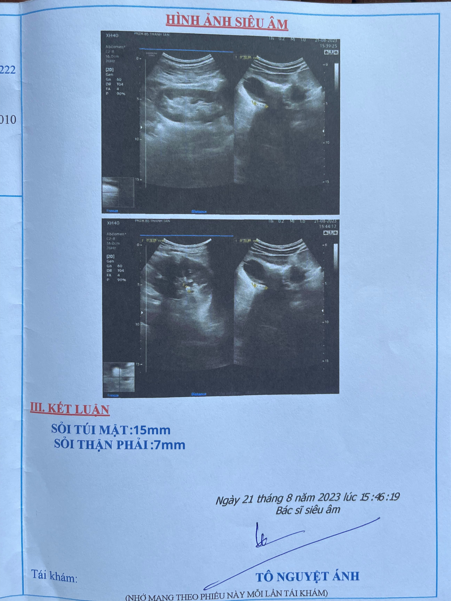 “Đau quá không chịu được tôi đi khám tại bệnh viện đa khoa Gò Dầu, bác sĩ chẩn đoán tôi mắc sỏi túi mật 15mm và sỏi thận 7mm. Sỏi kích thước lớn nên bác sĩ khuyên tôi nên sớm phẫu thuật cắt túi mật.