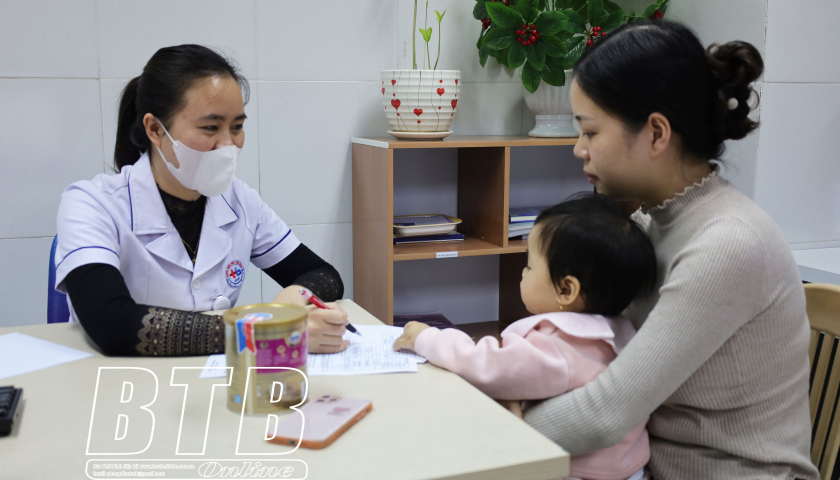 Cán bộ Khoa Dinh dưỡng, Bệnh viện Nhi Thái Bình tư vấn việc bổ sung dinh dưỡng cho trẻ.