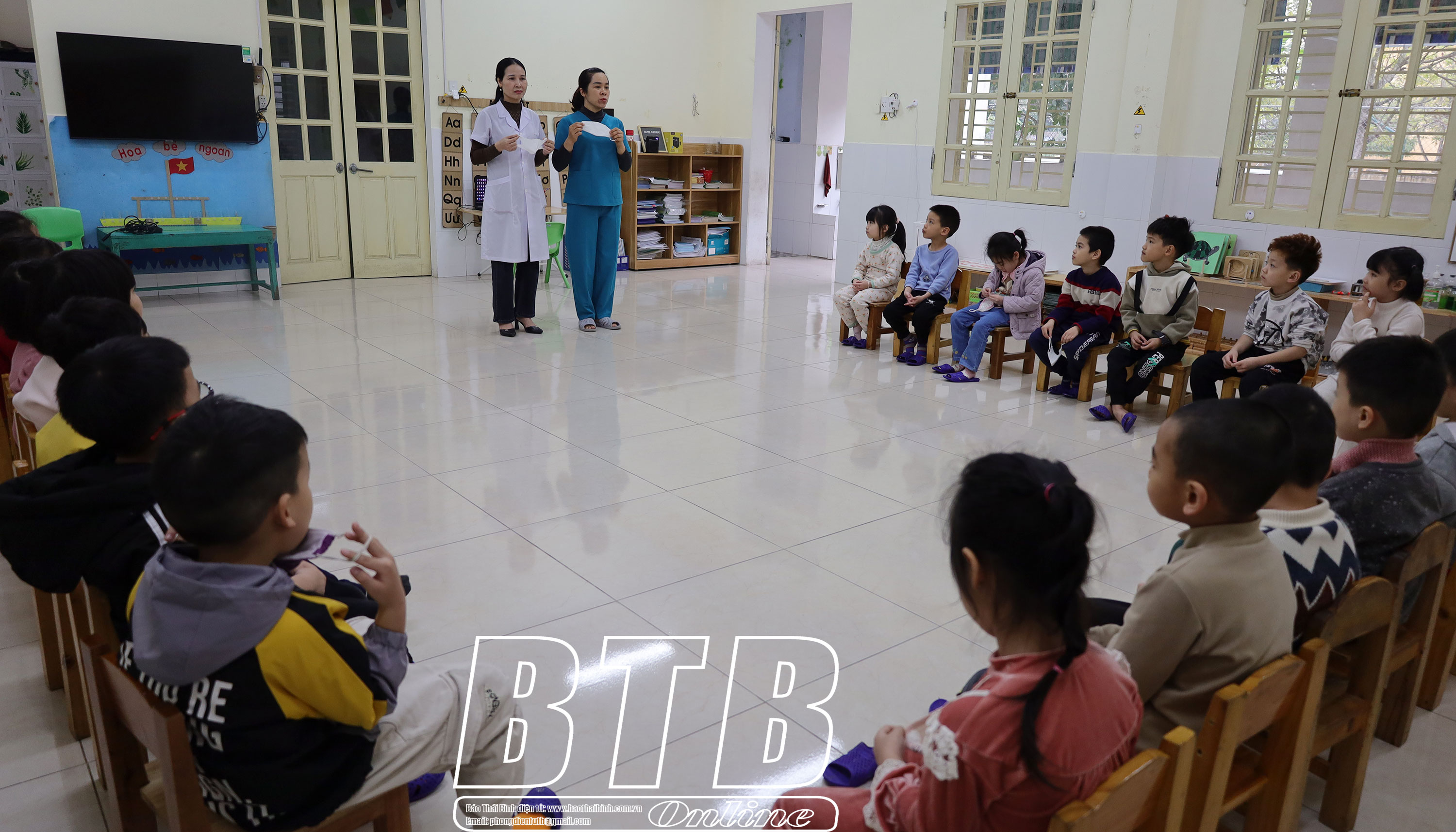 Cán bộ Trạm Y tế phường Trần Lãm phối hợp với Trường Mầm non Trần Lãm (thành phố Thái Bình) hướng dẫn trẻ đeo khẩu trang đúng cách để phòng bệnh truyền nhiễm.