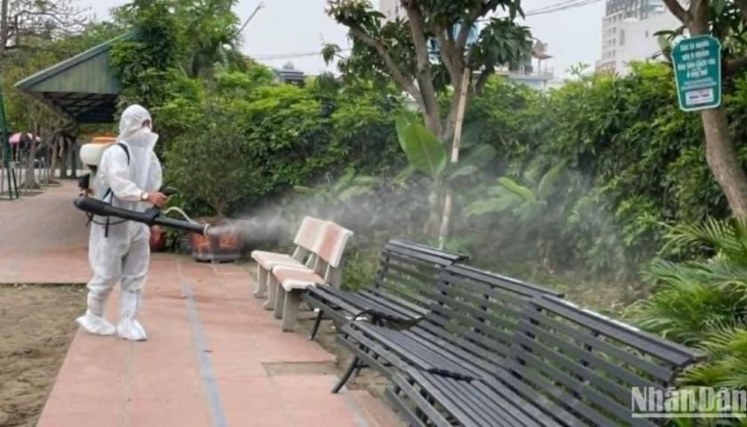 Phun thuốc khử trùng môi trường tại trường Trung học cơ sở Trần Phú (thành phố Thái Bình), nơi phát hiện chùm ca bệnh sởi liên quan đến 8 học sinh.