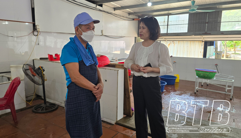 Cán bộ Sở Y tế trao đổi cùng người phụ trách bếp ăn tập thể tại một doanh nghiệp trên địa bàn huyện Đông Hưng về quy trình bảo đảm an toàn thực phẩm bếp an tập thể.