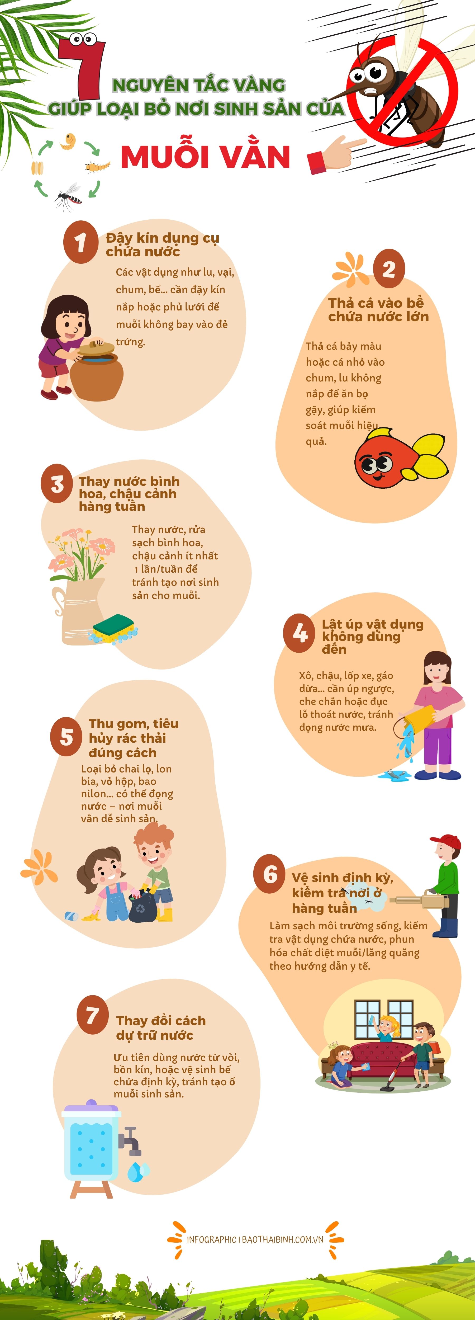 Muỗi vằn (Aedes aegypti) là tác nhân chính truyền bệnh sốt xuất huyết, Zika, sốt vàng da và nhiều bệnh nguy hiểm khác. Chúng thường chọn các dụng cụ chứa nước sạch xung quanh nhà làm nơi đẻ trứng. Vì vậy, loại bỏ nơi sinh sản của muỗi vằn chính là biện pháp phòng bệnh đơn giản, thiết thực và hiệu quả nhất mà mỗi người dân có thể chủ động thực hiện ngay tại gia đình mình để phòng một số bệnh truyền nhiễm nguy hiểm nêu trên. Trung tâm kiểm soát bệnh tật tỉnh Thái Bình đã khuyến cáo 07 nguyên tắc vàng giúp người dân có thể chủ động loại bỏ nơi muỗi vằn sinh sản.