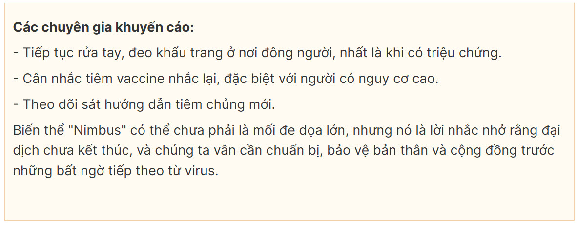 - Người từ 65 tuổi trở lên hoặc người có bệnh nền nên tiêm vaccine ngay, nếu đủ điều kiện, để có thêm lớp bảo vệ trước nguy cơ làn sóng mùa hè. Sau đó, vẫn có thể tiêm nhắc lại vào mùa thu khi vaccine phiên bản mới (có thể đã được điều chỉnh để kháng Nimbus) được công bố.