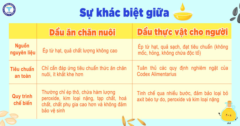 Theo Viện Y học ứng dụng Việt Nam, dầu thực vật dùng trong chăn nuôi và dầu thực vật dùng để chế biến thực phẩm cho người tuy có cùng nguồn gốc (đậu nành, hướng dương, cải, cọ, hạt lanh, oliu,…) nhưng có sự khác biệt lớn về mục đích, chất lượng, quy trình xử lý và tiêu chuẩn an toàn.