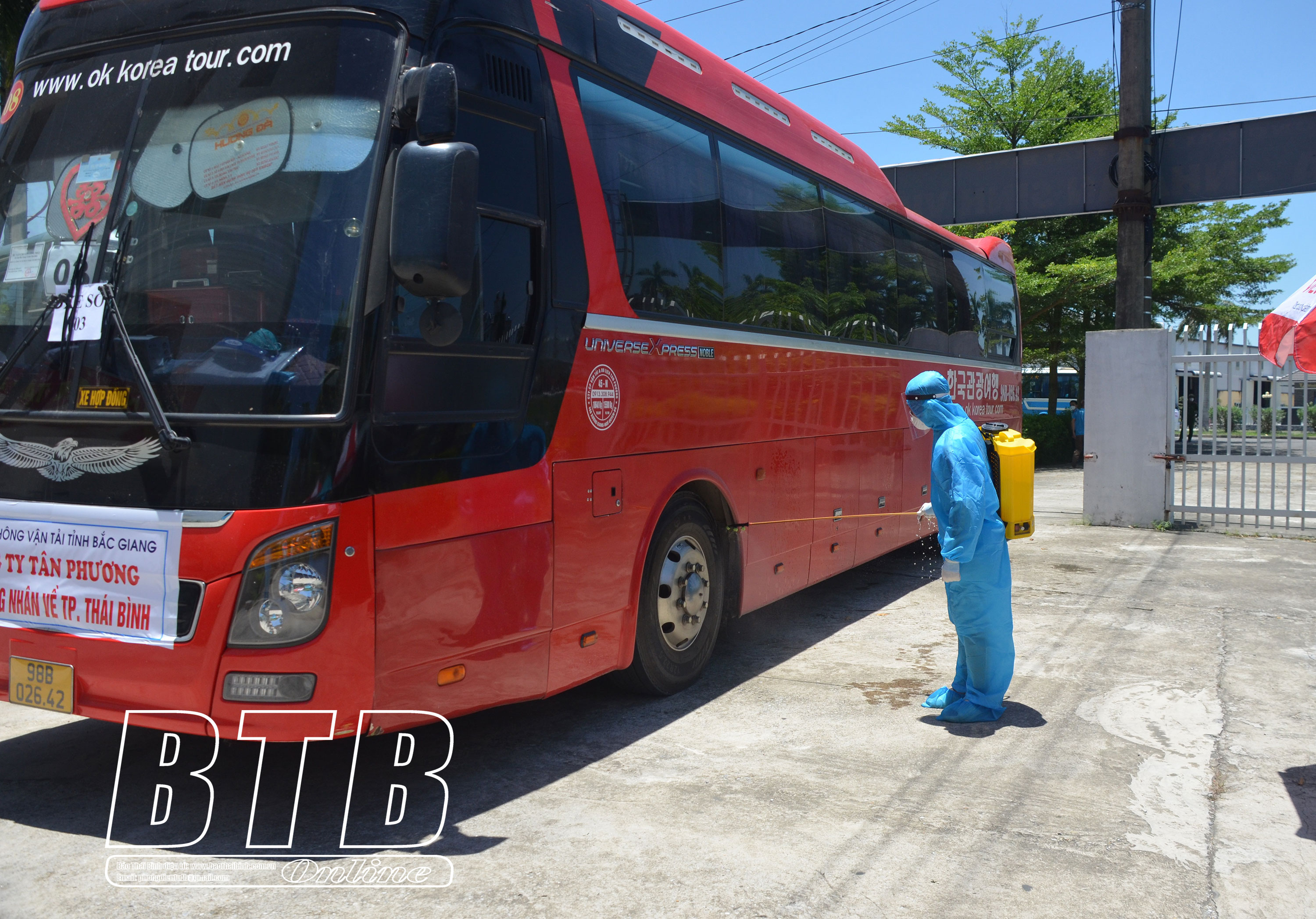 Phương tiện vận chuyển công nhân lao động được phun thuốc khử trùng trước khi vào khu cách ly.