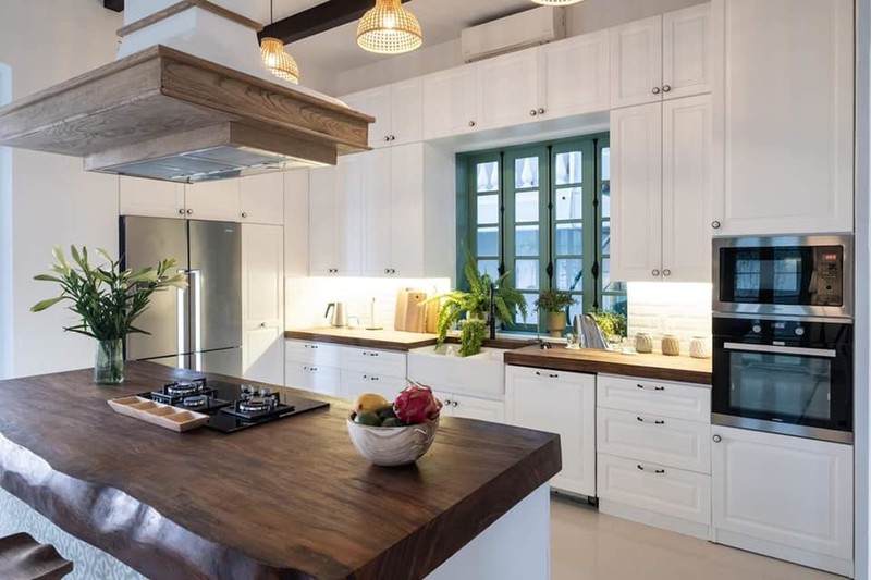 Không gian bếp ưu tiên việc tụ tập nấu nướng đông người nên làm rộng rãi. Góc phòng ăn, bếp với view thẳng ra hồ bơi và ruộng. Bếp màu trắng giữ gìn cẩn thận nên vẫn mới và sáng sủa.