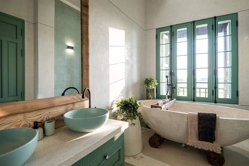 Buồng tắm phòng master nhìn ra ngoài ruộng.