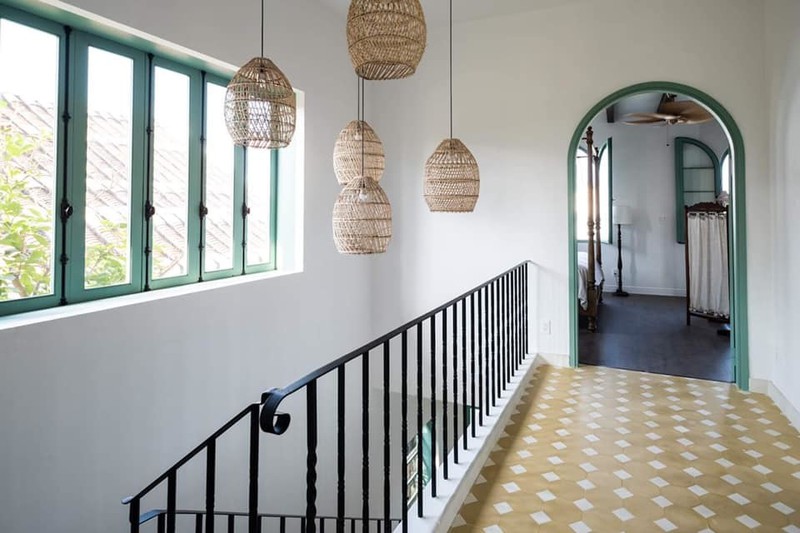 Sảnh tầng 2, lan can bằng sắt sơn đen. Mọi chi tiết bên trong được decor kỹ càng, từ đèn thả trần đến tay vịn cầu thang.