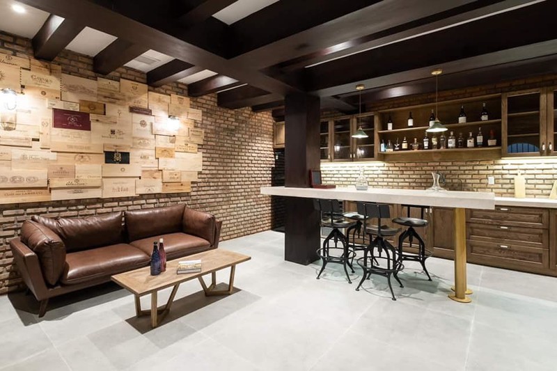 Hầm rượu của ông xã chị Vân Anh. Phía sau tường là những miếng gỗ từ thùng rượu được thu gom từ khắp nơi trên thế giới.