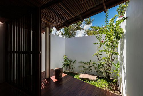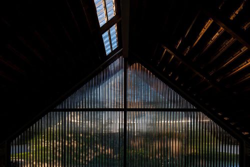 Đồng thời, nhờ sử dụng những tấm cửa kính dạng song gỗ, không gian ngôi nhà trở nên đa chiều hơn, một mặt kết nối hai khối chức năng chính, mặt khác kết nối không gian bên ngoài và bên trong.