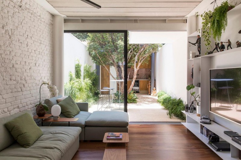 Tầng trệt được thiết kế bao gồm phòng bếp, phòng khách. Gia chủ lựa chọn cửa kính trượt để mở rộng không gian. Đứng bên trong nhà có thể nhìn ra khu vườn phía mặt đường lớn.