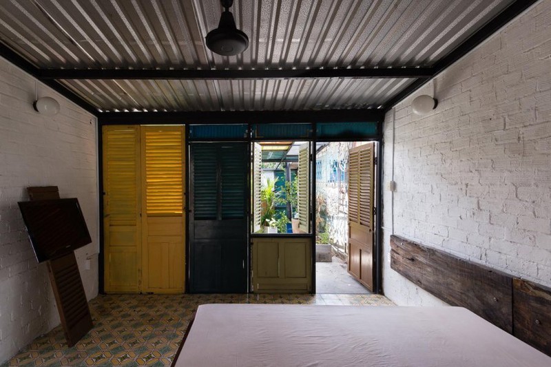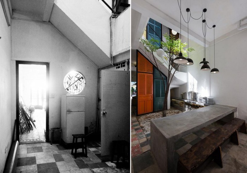 Vật liệu của các bức tường và sàn nhà vẫn được giữ nguyên. Bề mặt xi măng không tinh chế, cửa sổ bằng gỗ jalousie và phên tre trên trần tạo nên một không gian vừa hiện đại vừa cổ kính, đồng thời làm sống lại kiến trúc Việt Nam những năm 60-70.