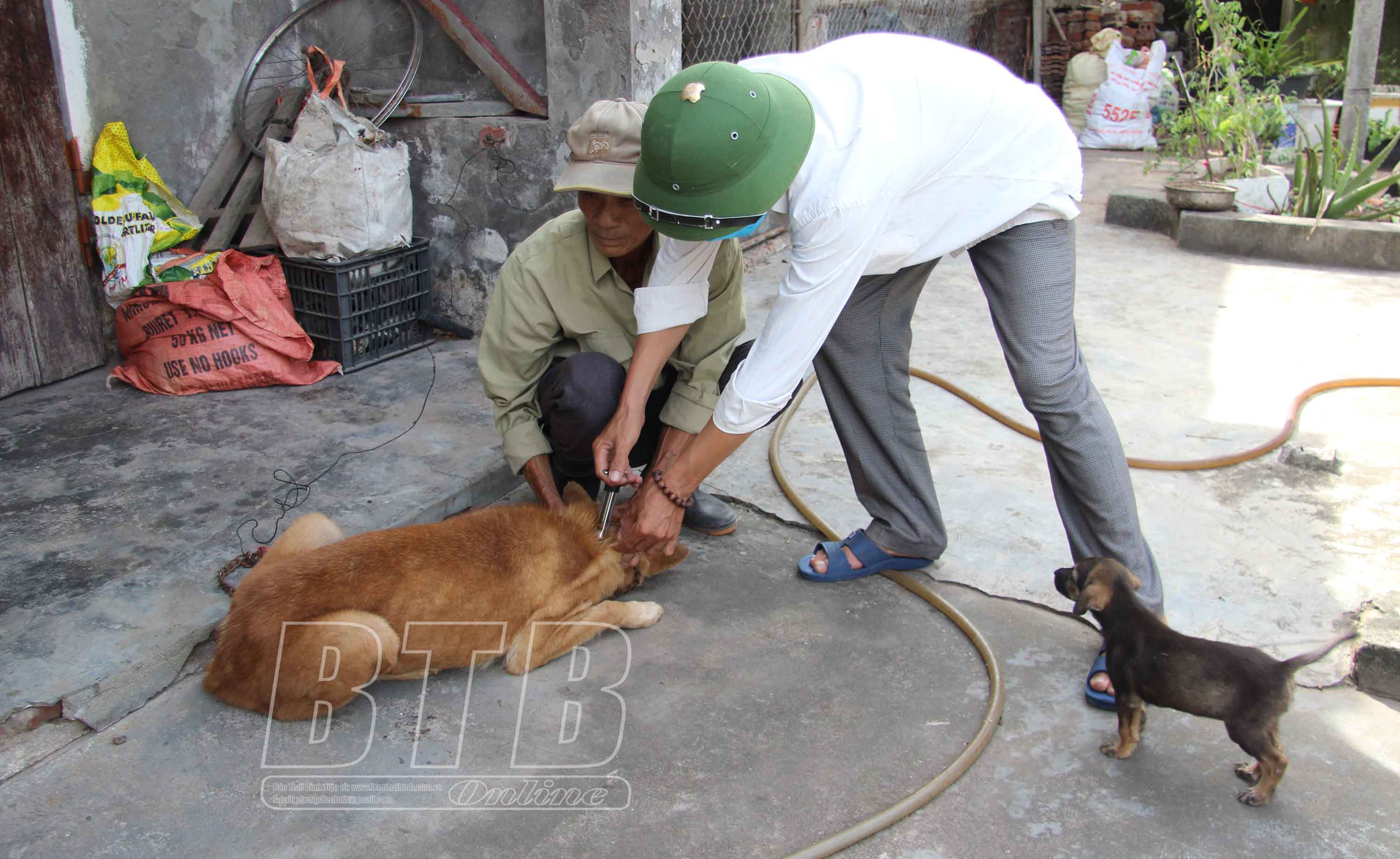 Hộ dân xã Nam Thanh (Tiền Hải) tiêm vắc-xin phòng dại cho đàn chó.
