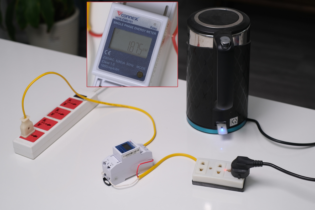 Thử nghiệm lắp đặt công tơ với một bình đun nước siêu tốc. Ngay sau khi bật bình, thông số trên công tơ bắt đầu hiển thị theo thời gian thực. Công suất đo được cao nhất là khoảng 1.800 W, tương đương công suất của bình siêu tốc. Để thay đổi thông số hiển thị về hiệu điện thế, dòng điện, công suất và lượng điện tiêu thụ, người dùng chỉ cần nhấn nút Mode trên thân sản phẩm. Màn hình có đèn nền nên có thể quan sát trong điều kiện tối.