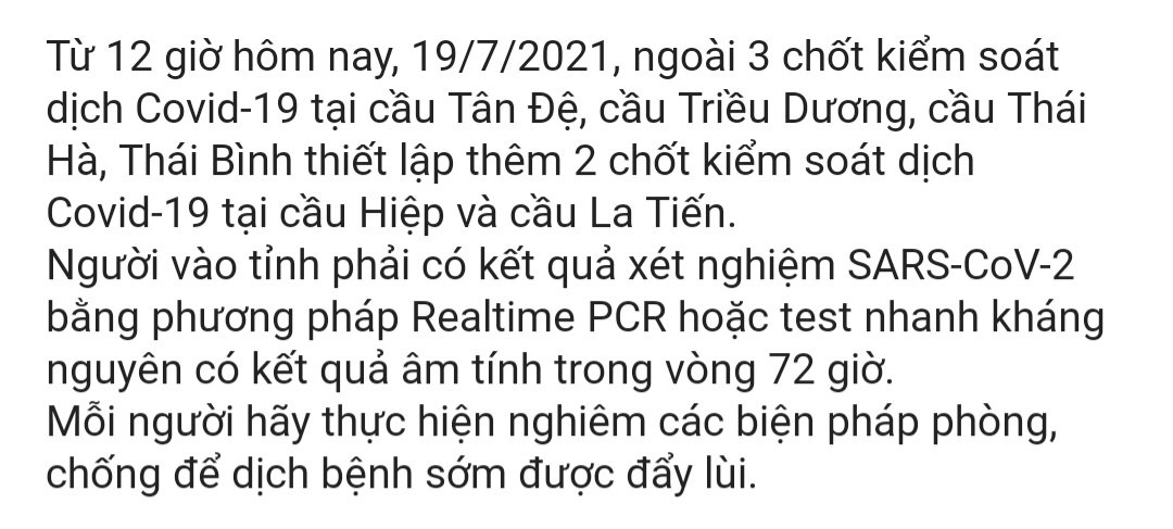 Thái Bình thiết lập thêm 2 chốt kiểm soát dịch Covid-19 tại cầu Hiệp và cầu La Tiến