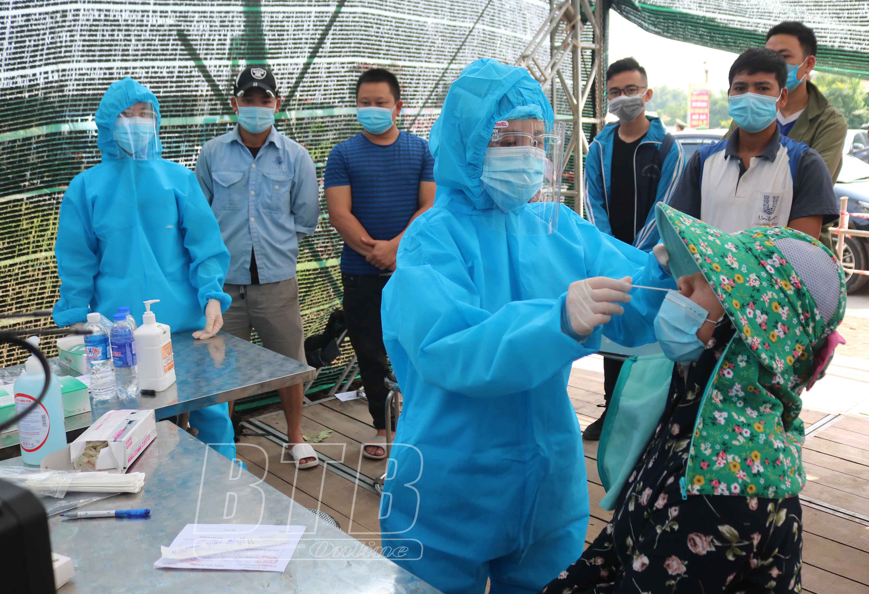 Cán bộ Trung tâm Y tế huyện Quỳnh Phụ lấy mẫu xét nghiệm SARS-CoV-2 cho người dân tại chốt kiểm soát dịch Covid-19 cầu Hiệp.