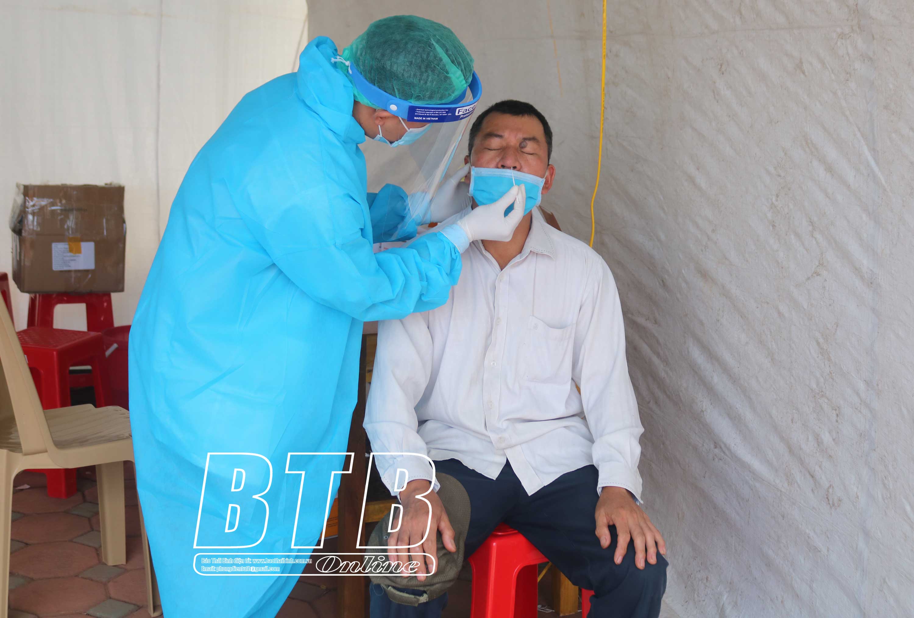 Người dân thực hiện việc test nhanh tại chốt kiểm soát dịch Covid-19 cầu Thái Hà (Hưng Hà).
