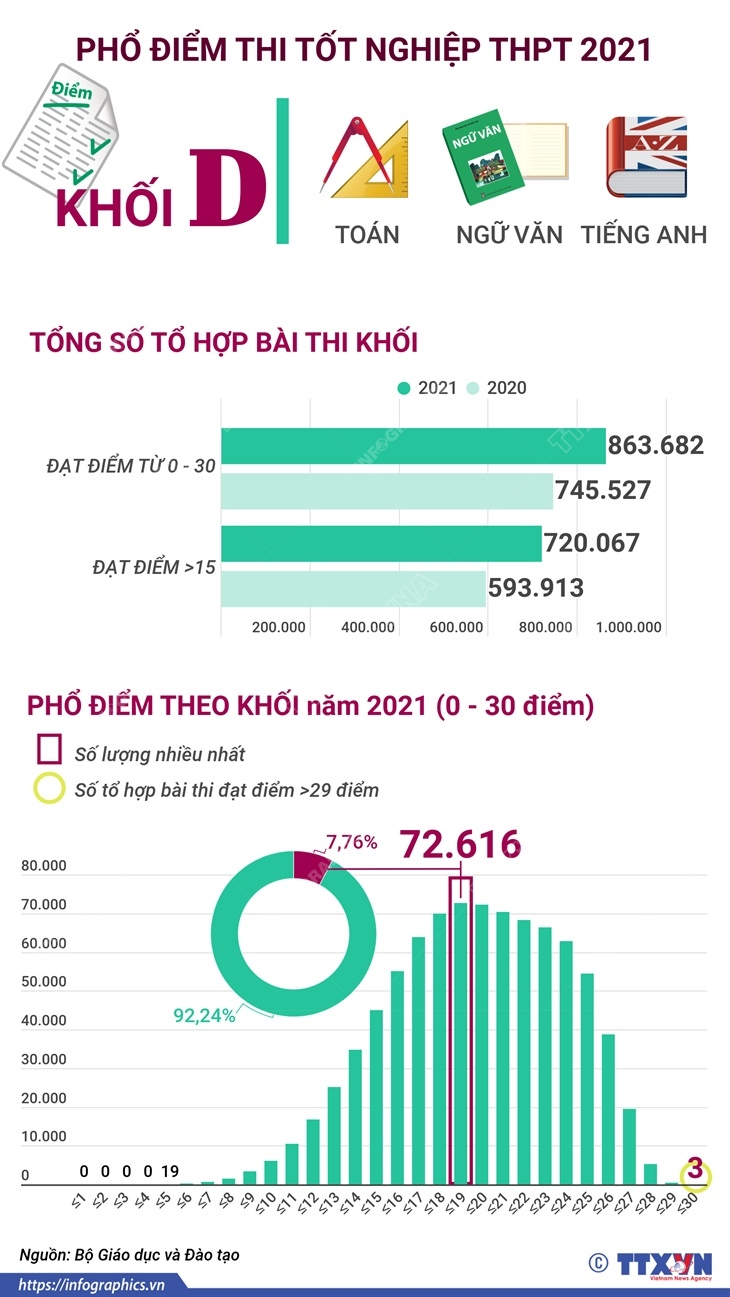 Ngày 26/7/2021, cùng với việc công bố phổ điểm các môn thi của Kỳ thi tốt nghiệp THPT năm 2021 đợt 1, Bộ Giáo dục và Đào tạo đã công bố kết quả phân tích phổ điểm của một số khối thi. Theo đó, ở khối D, số thí sinh đạt điểm từ trên 19-20 điểm là nhiều nhất.