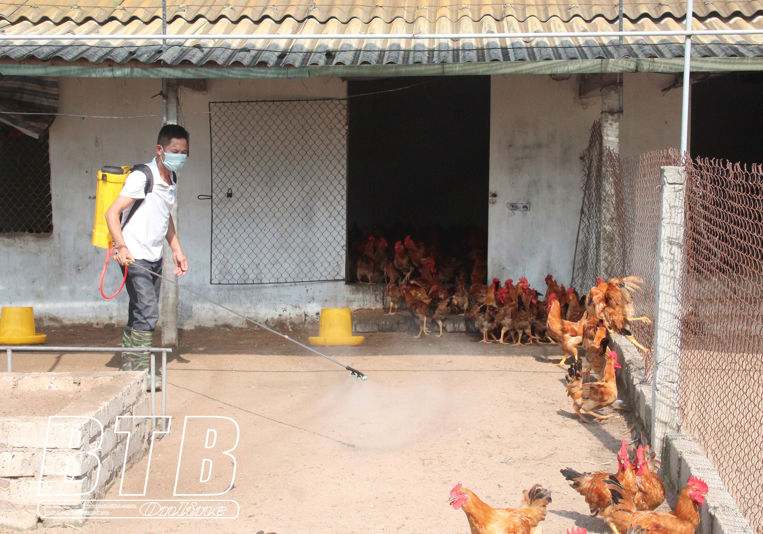 Người chăn nuôi xã Quỳnh Hoàng (Quỳnh Phụ) chủ động phun vệ sinh tiêu độc, khử trùng chuồng trại để tiêu diệt mầm bệnh.