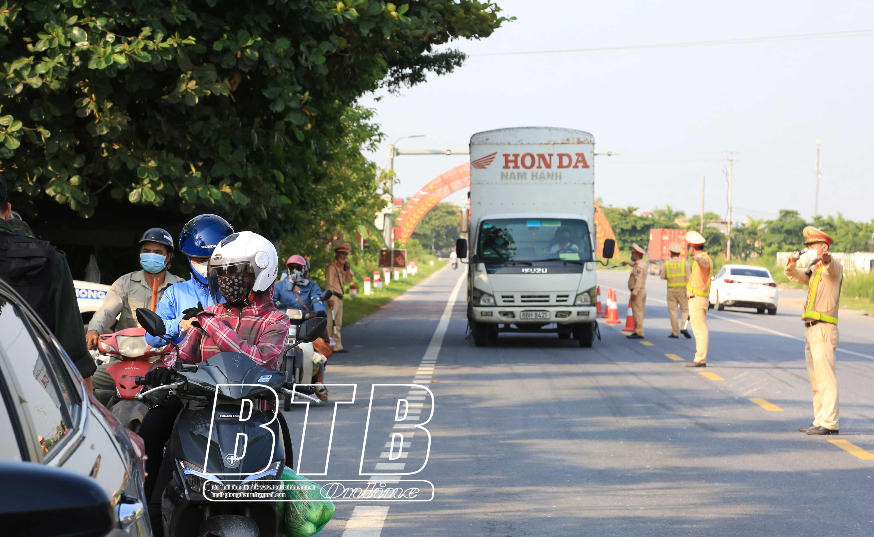 Các lực lượng kiểm tra người và phương tiện lưu thông qua chốt kiểm soát dịch cầu Nghìn (Quỳnh Phụ).