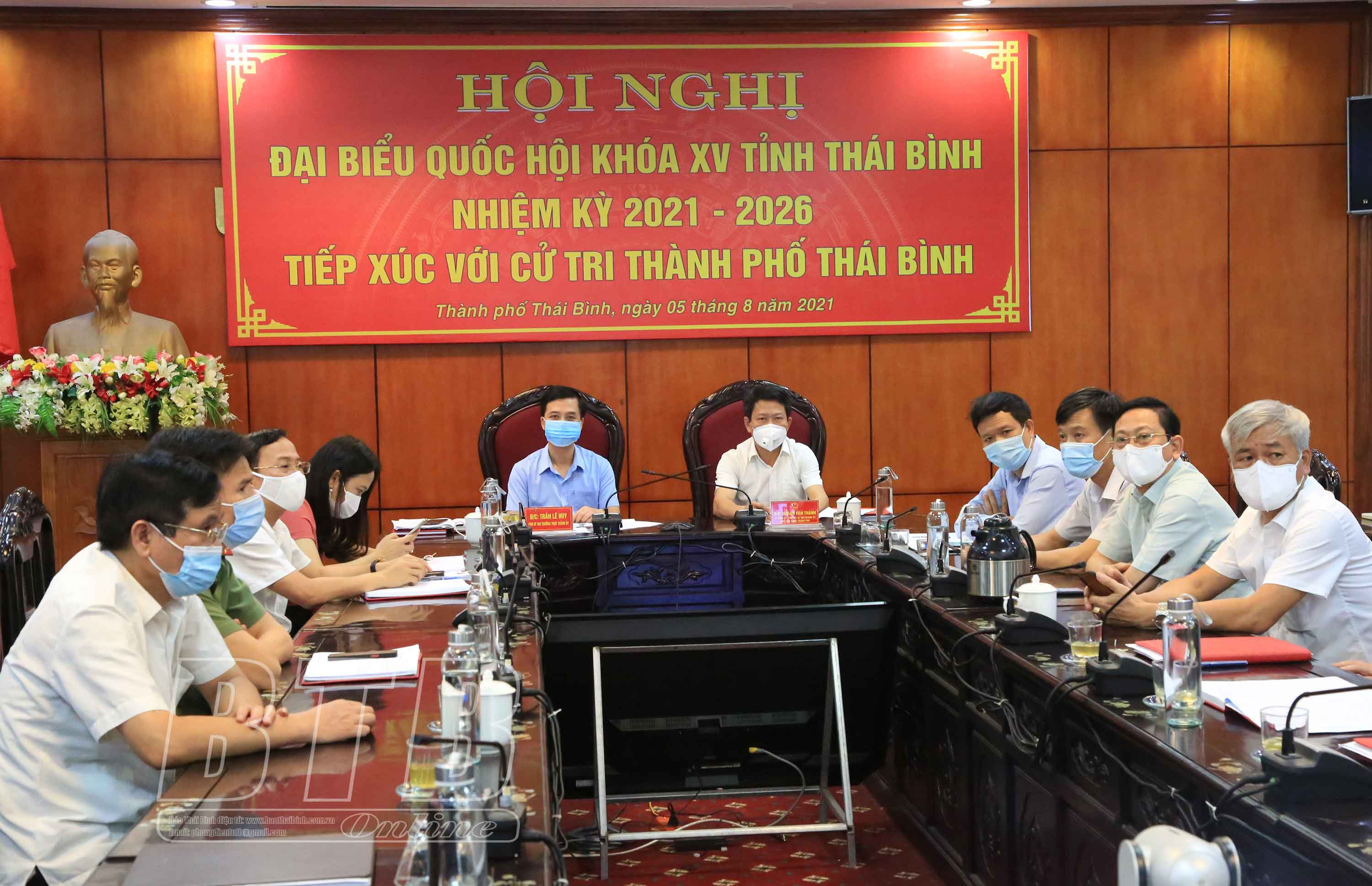 Đại biểu cử tri thành phố Thái Bình dự hội nghị trực tuyến tại điểm cầu UBND thành phố.