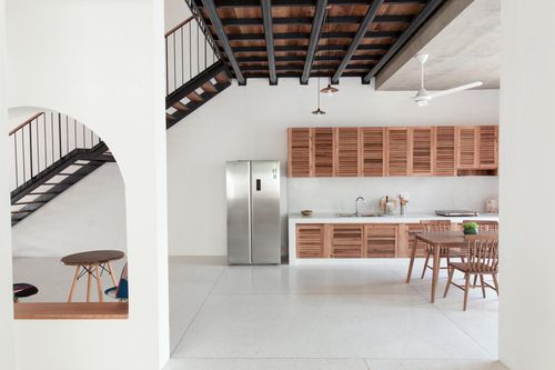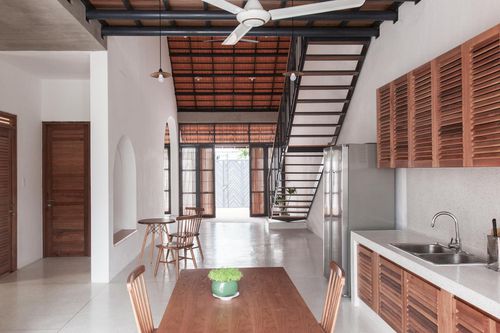 Ngôi nhà có hai cửa ở tầng trệt, cho phép ánh sáng và không khí lưu thông tự nhiên trong nhà. Đây là nơi bày bàn ăn và phòng bếp lớn.