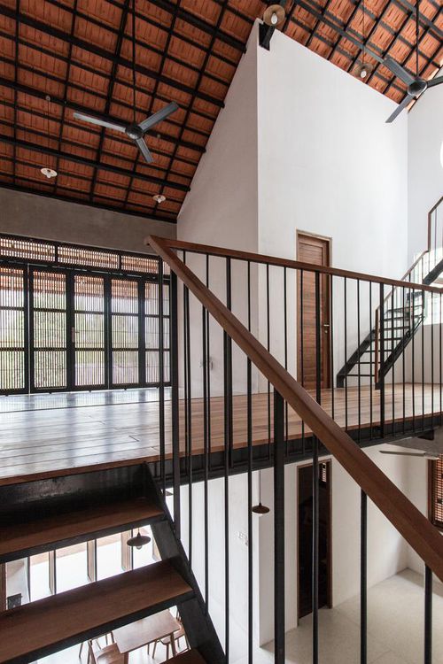 Bằng cách sử dụng hình thức mái dốc của ngôi nhà truyền thống và phòng thông tầng cho phép ánh sáng và gió tràn vào điểm cao nhất của mái nhà.