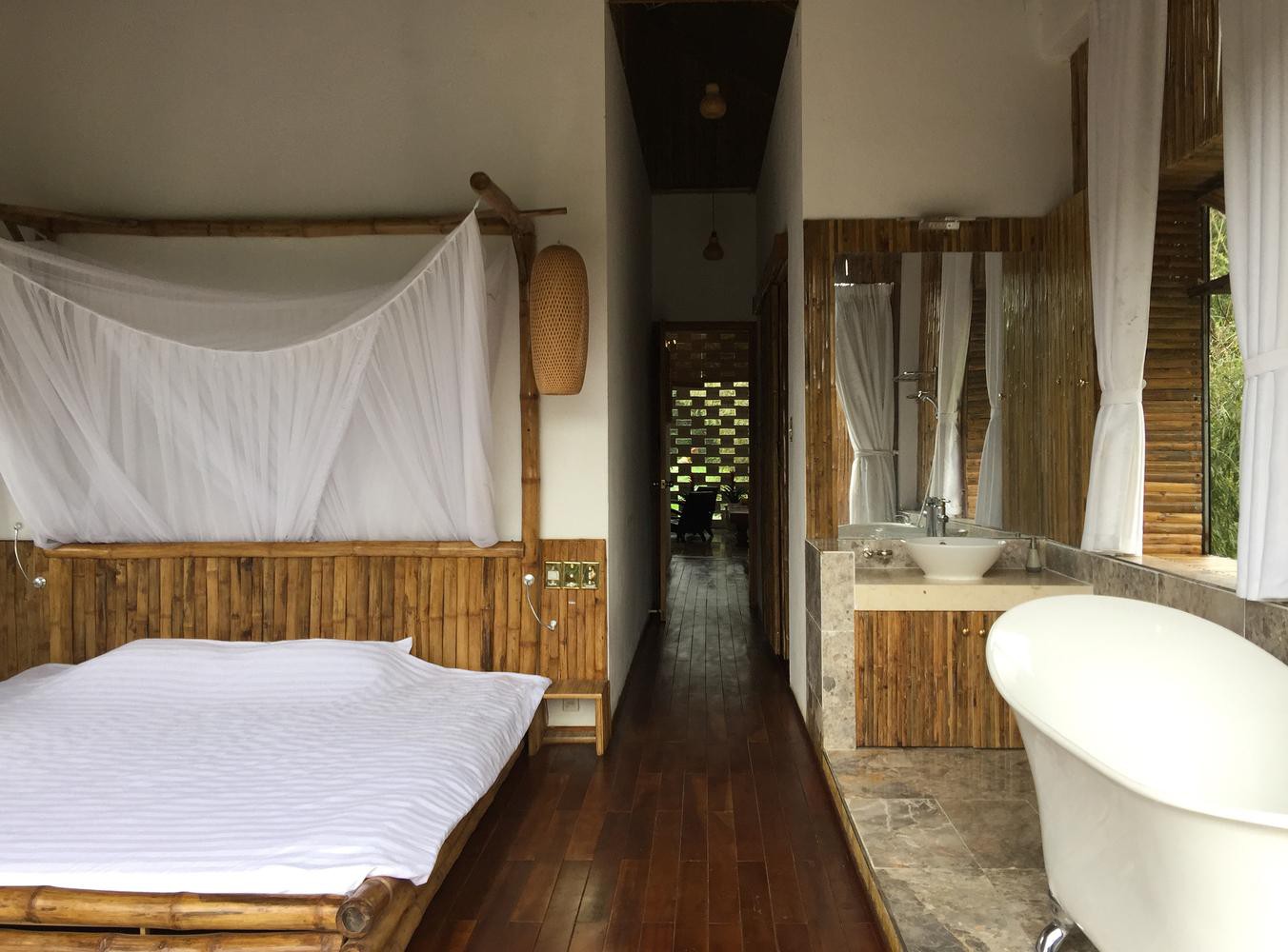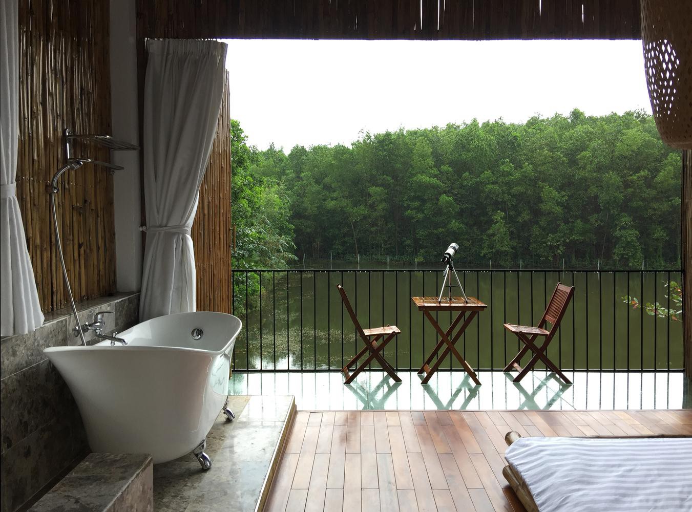 Phòng ngủ chính có mặt tiền thông thoáng hoàn toàn, tạo không gian tiếp xúc trực tiếp với thiên nhiên. Tầng phòng ngủ có nhịp dầm dài tới 4,5m không có cột, đáp ứng không gian ăn uống mở bên dưới.