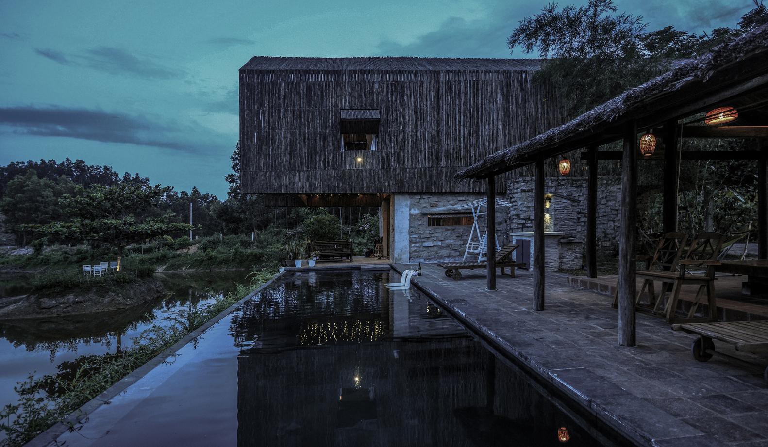 Ngôi nhà hai tầng, hình dáng đơn sơ, vách tre độc được thiết kế để đón gió từ mọi phía và vươn ra mặt hồ. Vỏ ngôi nhà gồm hai lớp tre, trong và ngoài, có lớp chống thấm ở giữa. Không khí lưu thông giữa các lớp giúp bên trong nhà luôn mát mẻ. Lớp vỏ này còn che chắn cho tòa nhà khỏi tác động của khí hậu nhiệt đới và tạo ra một không gian sống thoải mái.