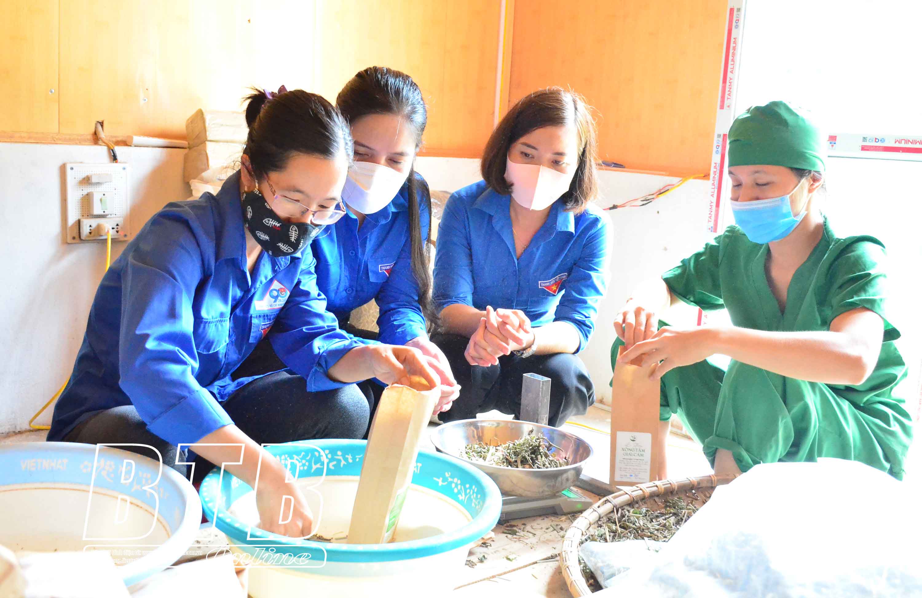 Tận dụng tất cả những gì đang có: bao bì, nhãn mác, nguyên liệu, chị Bùi Thị Duyên, thôn 2 An Định, xã Thụy Văn (Thái Thụy) cùng với các công nhân miệt mài sản xuất lá xông tắm, tinh dầu bạc hà từ dược liệu hữu cơ để gửi tặng lực lượng phòng, chống dịch và nhân dân Thành phố Hồ Chí Minh.