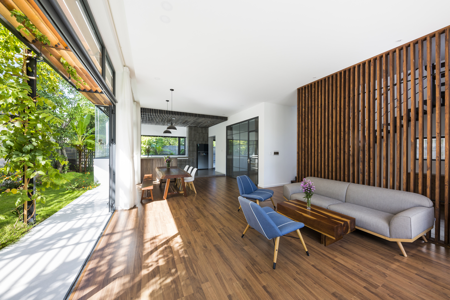 Căn nhà được thiết kế đơn giản với nhiều không gian, giúp cảm nhận được thiên nhiên.