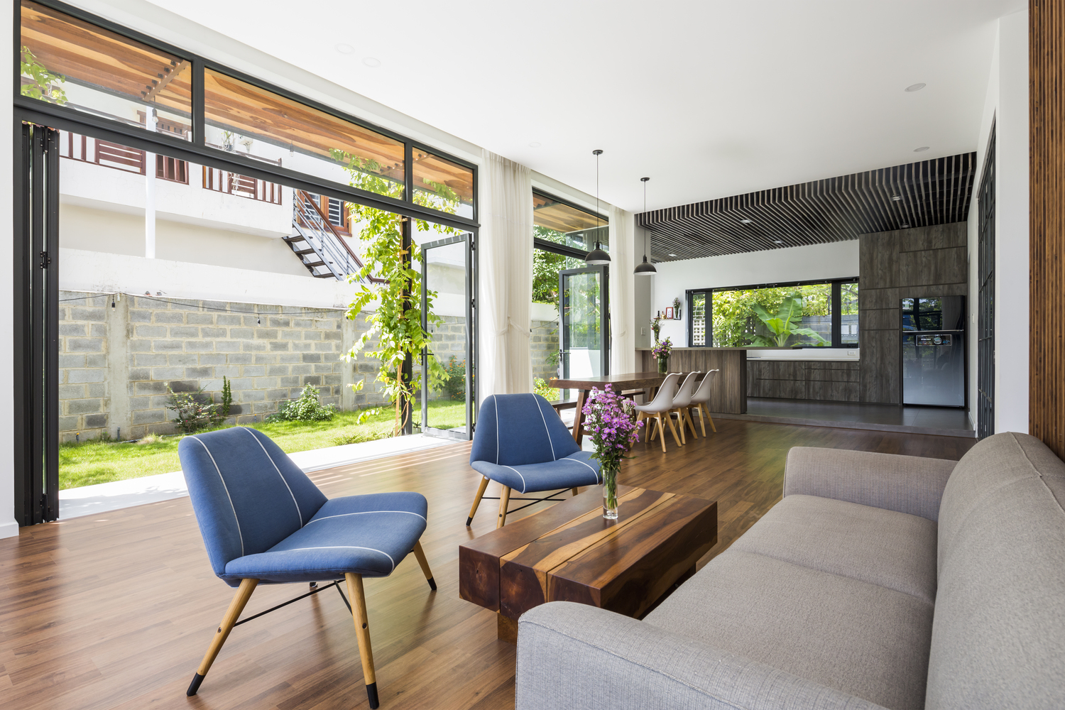 Nội thất tầng trệt theo phong cách hiện đại, được bố trí gọn gàng. Ngay tại không gian bếp, bàn ăn, hệ thống cửa thông ra sân vườn được thiết kế linh hoạt nhằm tối đa hóa sự kết nối giữa trong nhà và ngoài trời.