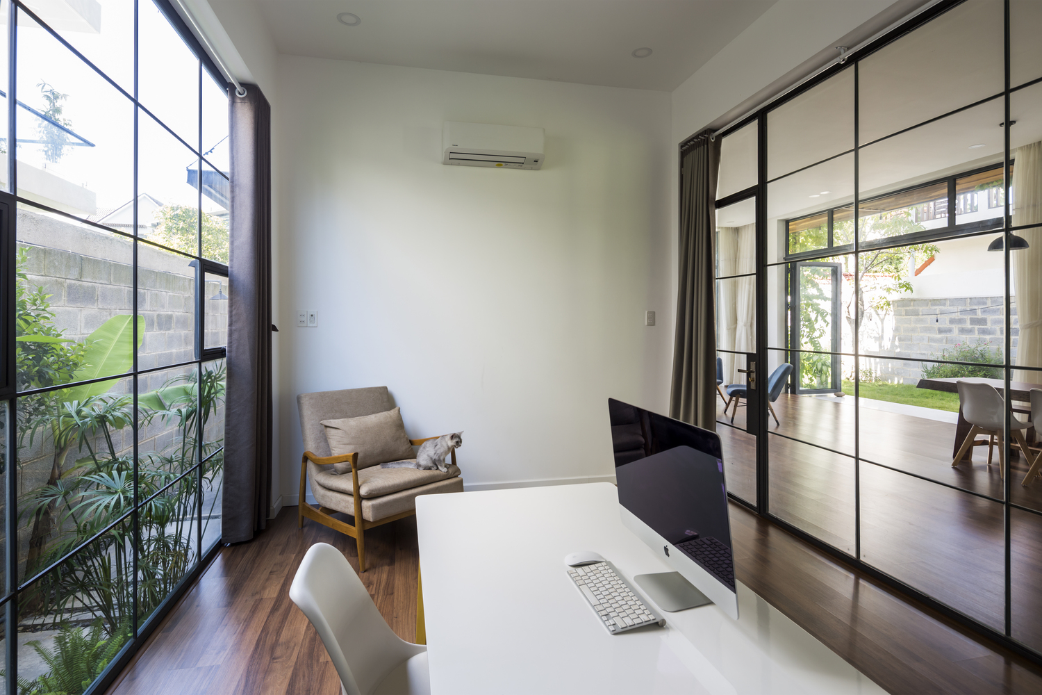 Để giữ sự riêng tư, tĩnh lặng nhưng vẫn hòa đồng với không gian sinh hoạt chung của tất cả các thành viên, phòng thư giãn, phòng làm việc của gia chủ được thiết kế với khung kính trong suốt.