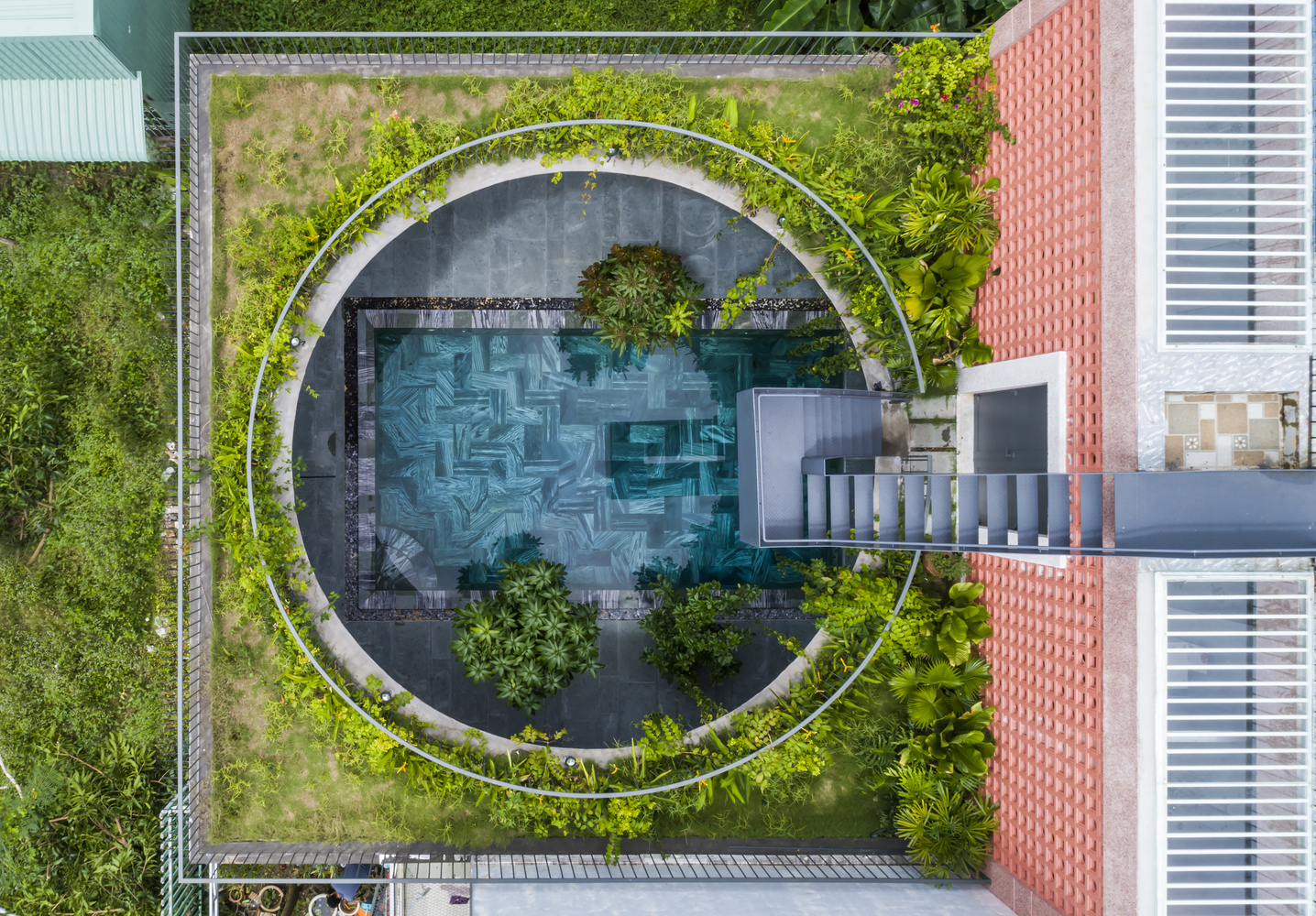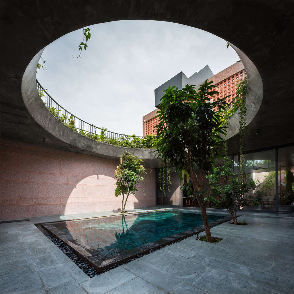 Không chỉ lấy gió và ánh sáng, giếng trời cùng với bể bơi tạo thành điểm nhấn cho ngôi nhà.