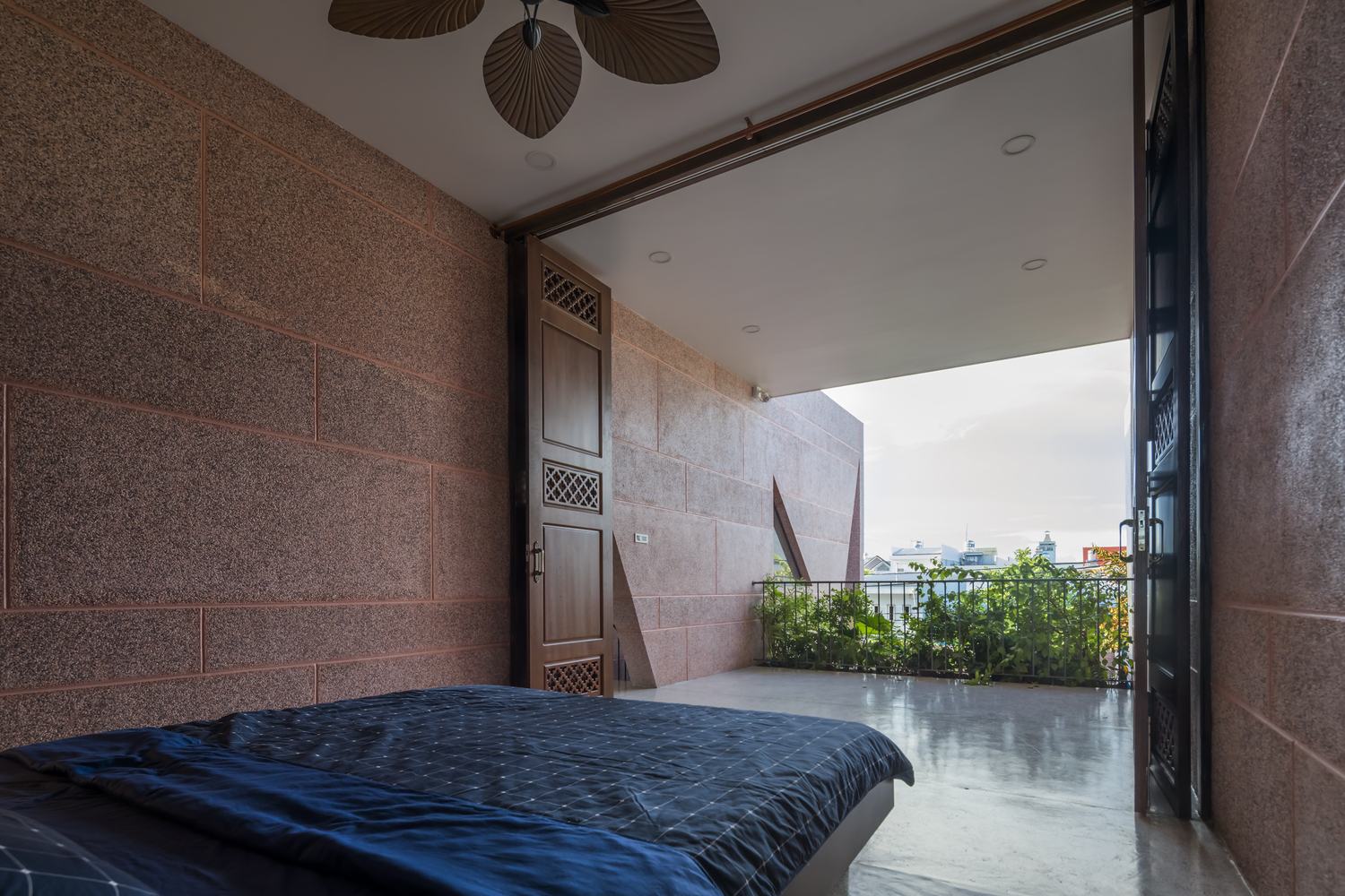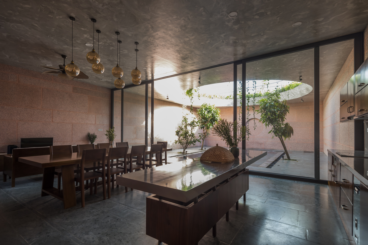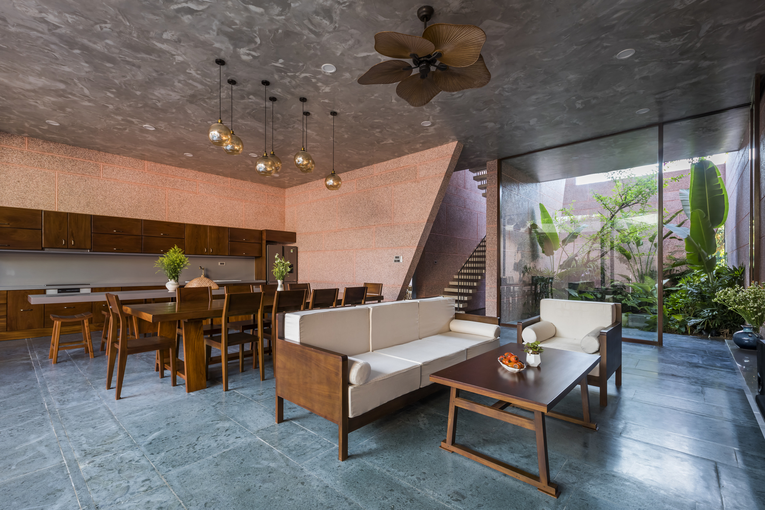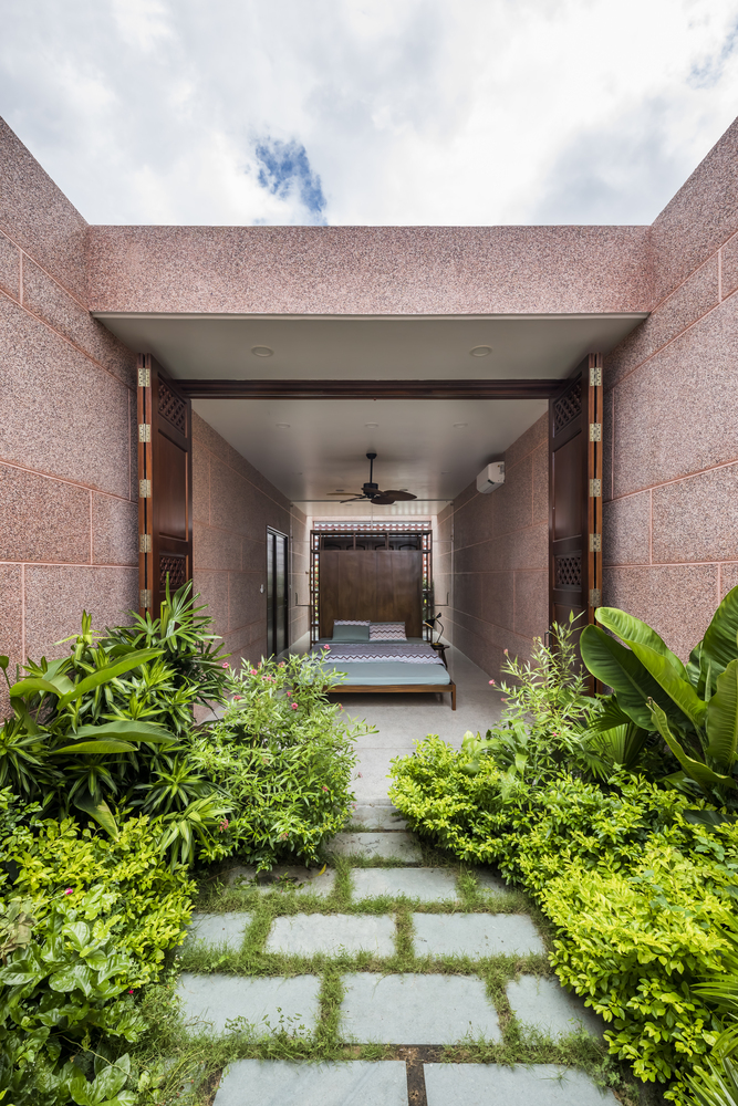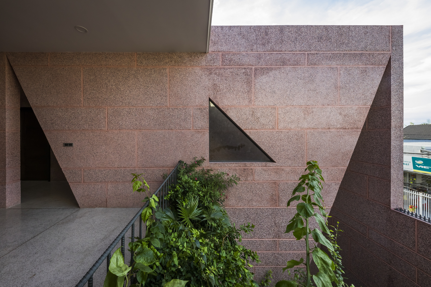 Không gian của Pink House được tách biệt thành các lớp khác nhau bằng vật liệu đá granit đồng nhất bên trong và bên ngoài.