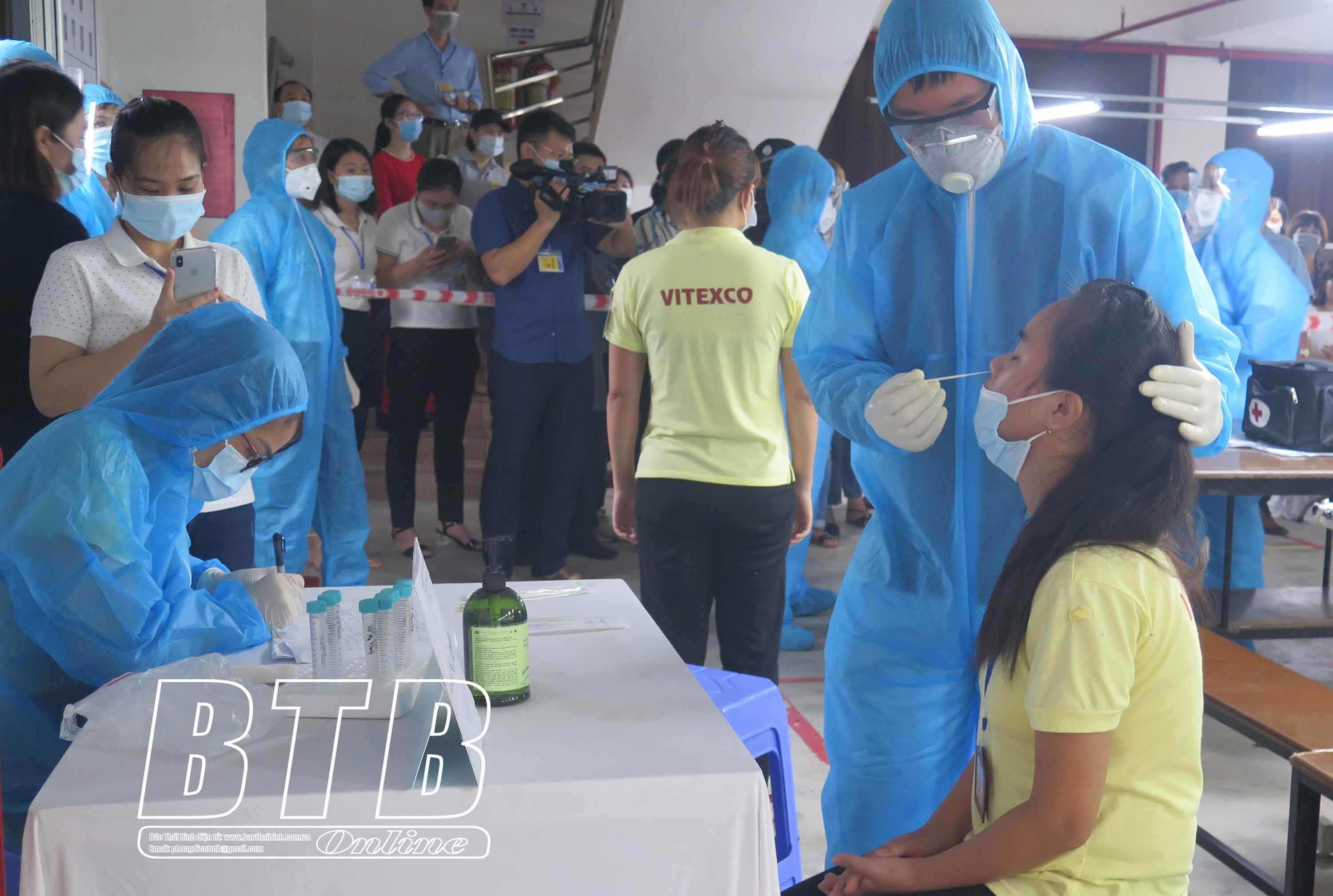 Xét nghiệm cho công nhân khi tình huống giả định xuất hiện ca F0 tại nhà máy may thuộc Công ty Cổ phần May xuất khẩu Việt Thái, CCN Thanh Tân trong buổi diễn tập.