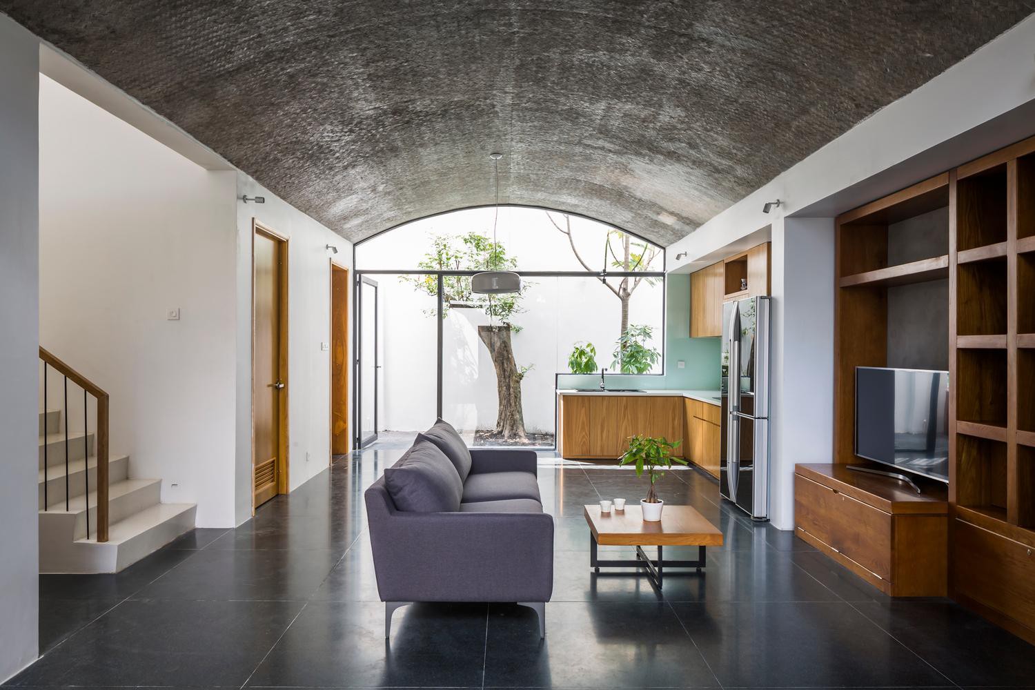 Không gian vòm lớn được kết nối với một vòm khác, gồm bếp, phòng khách thông qua cửa xếp. Nhà có phòng khách tối giản.