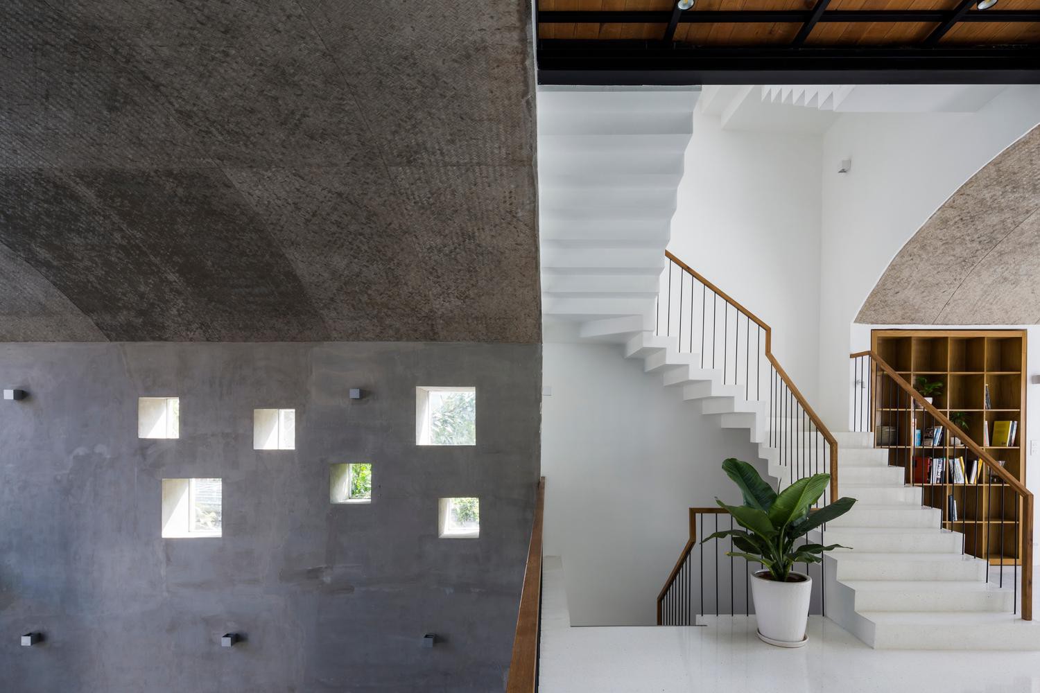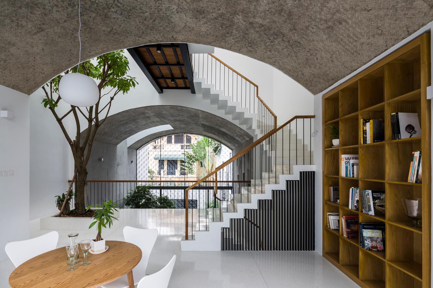 không gian vòm trên tầng hai là một khu học tập, nó là không gian mở, có luồng gió thổi từ phía trước ra phía sau của ngôi nhà khi mở cửa trượt, đem lại trải nghiệm giống như đang ở ngoài trời.