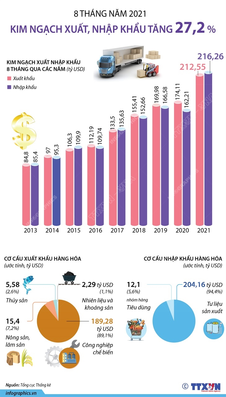8 tháng năm 2021, tổng kim ngạch xuất, nhập khẩu hàng hóa ước tính đạt ở mức cao, đạt 428,81 tỷ USD, tăng 27,2% so với cùng kỳ năm 2020, trong đó xuất khẩu đạt 212,55 tỷ USD, tăng 21,2%; nhập khẩu đạt 216,26 tỷ USD, tăng 33,8%.