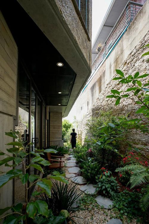 Yếu tố đường biên cũng được cân nhắc để tạo cảm giác lấp lửng, nhập nhằng Trong – Ngoài. Trái với cách sử dụng vật liệu đặc và nặng ở mặt tiền, lõi thang sắt giữa nhà được thiết kế như một yếu tố nhẹ nhàng, mỏng manh, trôi nổi.